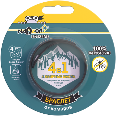 Силиконовый браслет для защиты взрослых и детей с 2 лет от нападения комаров. Материал, из которого состоит браслет, пропитан натуральным маслом цитронеллы, герань, лаванда и мята. Эфирная композиция обладает мощным отпугивающим эффектом, забивает рецепторы насекомых. Защищает не менее 100 часов. Браслет необходимо хранить в заводской герметичной упаковке, в промежутках между использованием. Браслет черного цвета в яркой фирменной упаковке. Браслет имеет застежку. Силиконовый браслет имеет пропитку из алоэ вера, служит увлажняющим компонентом для кожи.
