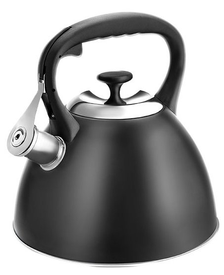 Чайник имеет нейлоновую ненагревающуюся ручку и свисток с кнопочным механизмом.
