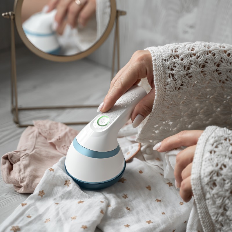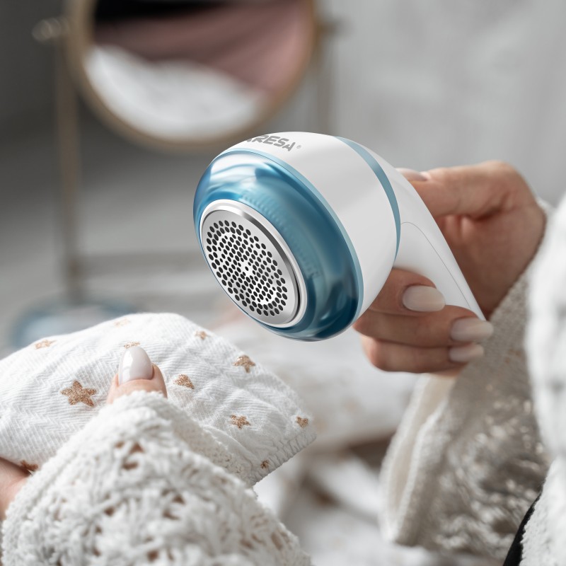 Деликатно удаляет катышки с одежды. Защитная решетка предотвращает повреждение ткани лезвиями.