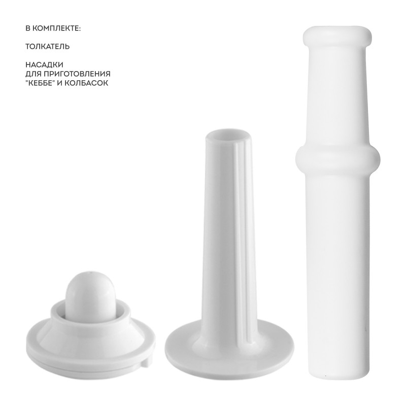 Диски мелкой, средней и крупной нарезки, а также дополнительные насадки для приготовления сосисок и «кеббе» позволят выбрать необходимую степень измельчения мяса.