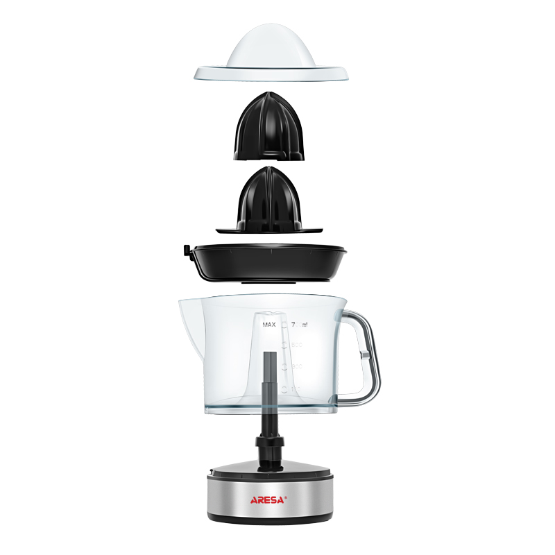 Конструкция Aresa AR-2503 дополнена нескользящими резиновыми ножками и пластиковой сеточкой. Комплектация включает чашу с защитной крышкой и 2 конуса. Данная модель соковыжималки позволяет регулировать количество мякоти, делая работу максимально простой и удобной.