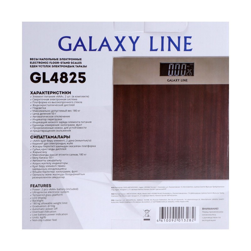 Дополнительным преимуществом GALAXY LINE GL4825 является функция "Термометр", которая позволяет измерять температуру помещения. Весы имеют лаконичный современный дизайн, ультратонкий корпус, платформа из высокопрочного стекла и большой жидкокристаллический дисплей. Прорезиненные ножки надежно фиксируют прибор на поверхности, препятствуя скольжению.