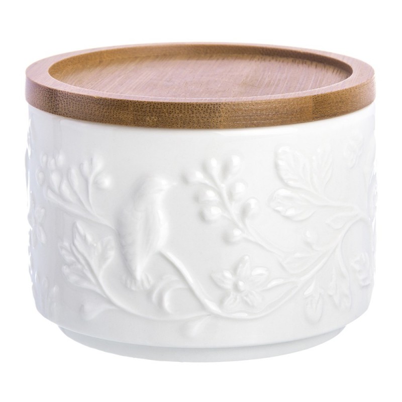 Банка для хранения «Птички на ветке» можно использовать для специй, для соусов, например, хрена или горчицы или для тертого сыра. Теплое цветовое решение и изящный рельеф баночки подходит любой сервировке и добавит уюта в каждый дом. Изделие с деревянной крышкой выполнено из высококачественного фарфора, а крышка — из натурального бамбука. Объем — 250 мл.