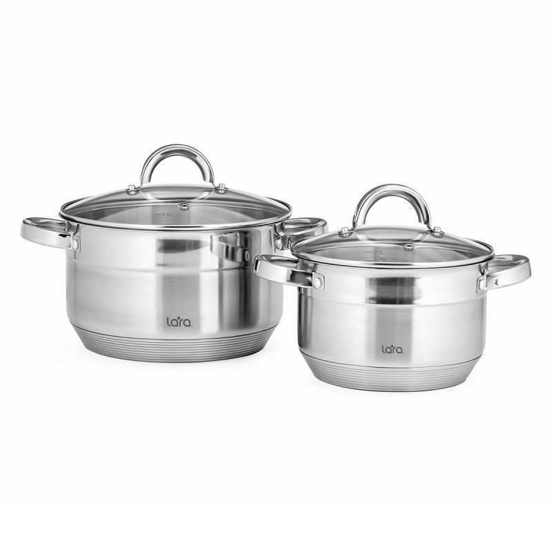 Набор посуды LARA серии «Aurora» разработан специально для хозяек, предпочитающих готовить много и впрок. Мы скомбинировали кастрюли самых востребованных объемов в одном наборе. Преимуществом данного комплекта посуды является 9-ступенчатое индукционное дно, которое подходит для всех типов плит. Привлекательный дизайн кастрюль с комбинированной полировкой стенок не оставит равнодушным. Удобство эксплуатации обеспечивают полые дугообразные ручки с зеркальной полировкой на надежных заклепках. Крышки из закаленного стекла с паровыпуском. Надежные, качественные и стильные кастрюли станут верными помощницами на вашей кухне и прослужат долгие годы.