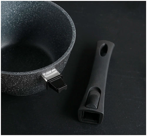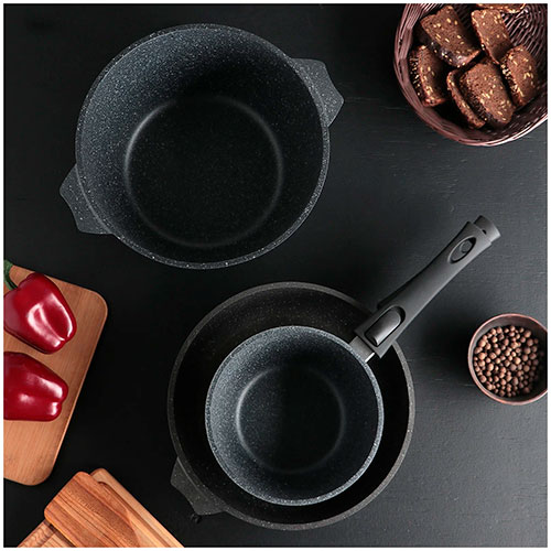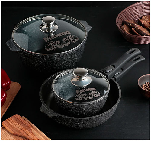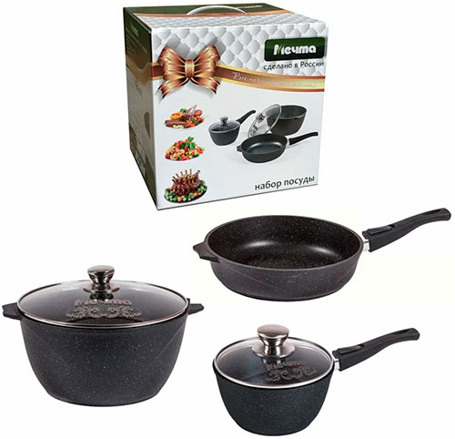 Сковорода, ковш и кастрюля имеют антипригарное покрытие повышенной стойкости. Такое покрытие в сочетании с высококачественным литым алюминием, из которого сделана посуда, позволяет равномерно распределять и прекрасно удерживать тепло, экономить электроэнергию и готовить пищу качественнее и быстрее. Значительная толщина стенок и дна исключает деформацию корпуса изделий, гарантирует долговечность посуды и равномерное распределение тепла при приготовлении пищи.