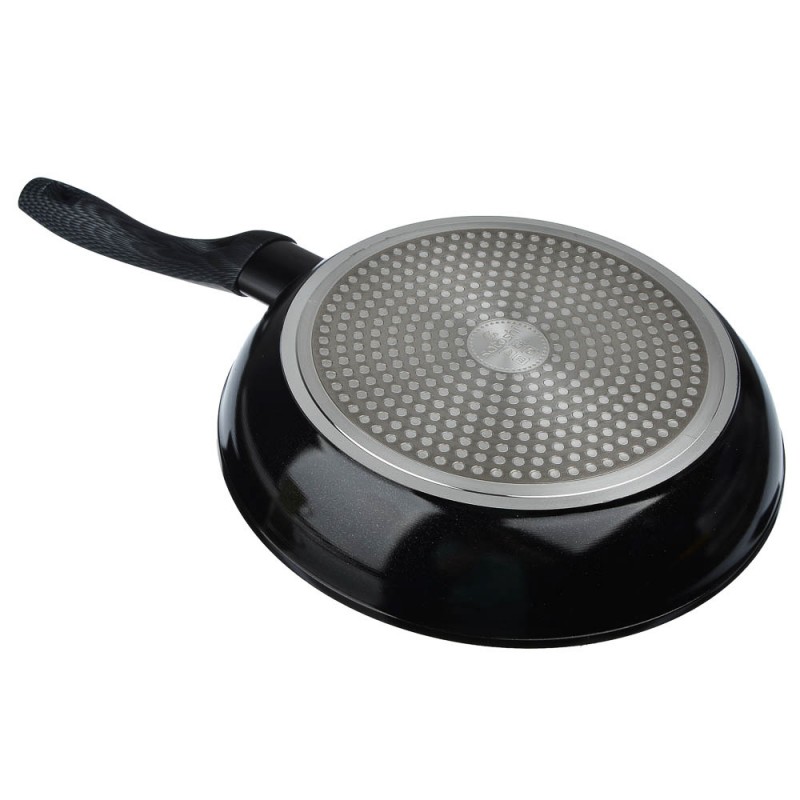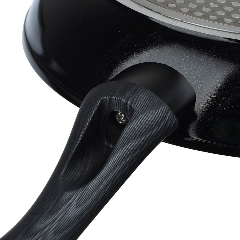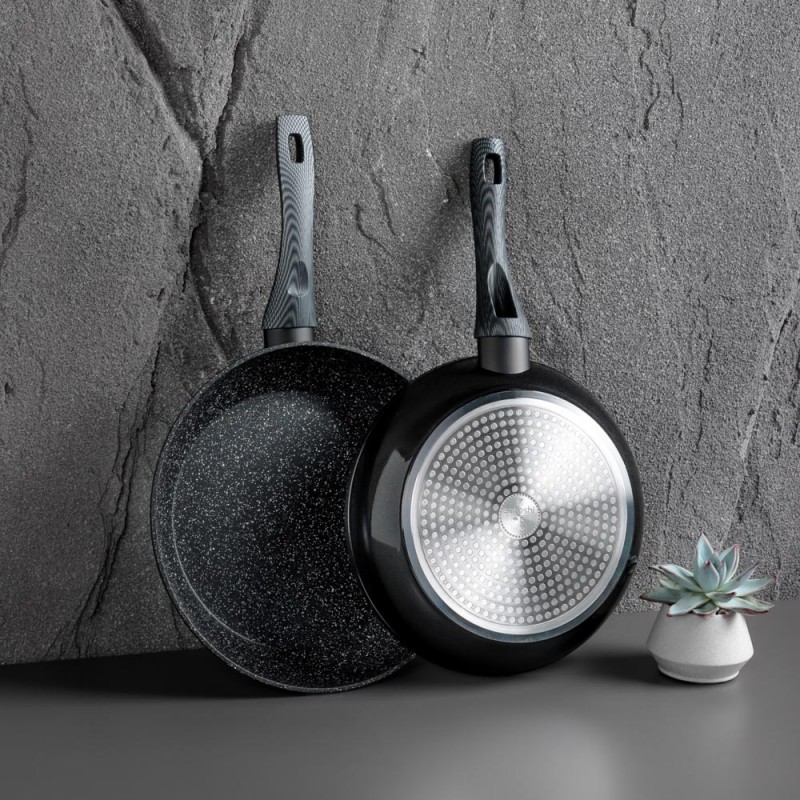 Отличительная особенность серии "Карбон" - это оригинальный графичный дизайн ручки черно-серого цвета. Сама ручка изготовлена из бакелита с силиконовым напылением, не нагревается и не скользит. Сковорода подходит для использования на всех видах плит, в том числе и индукционной плиты, а также для мытья в посудомоечной машине.
