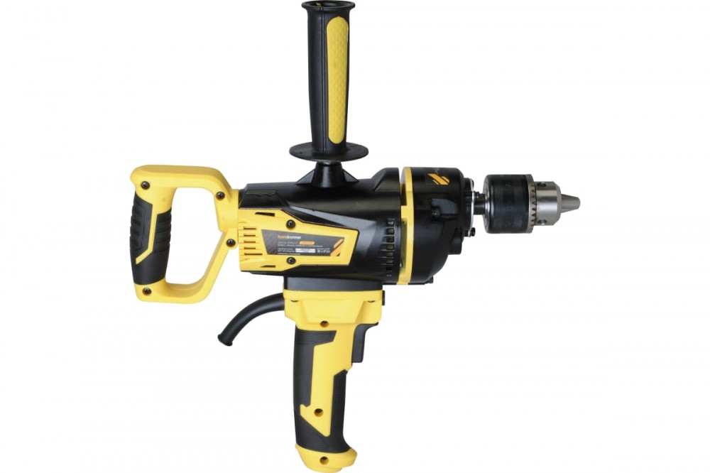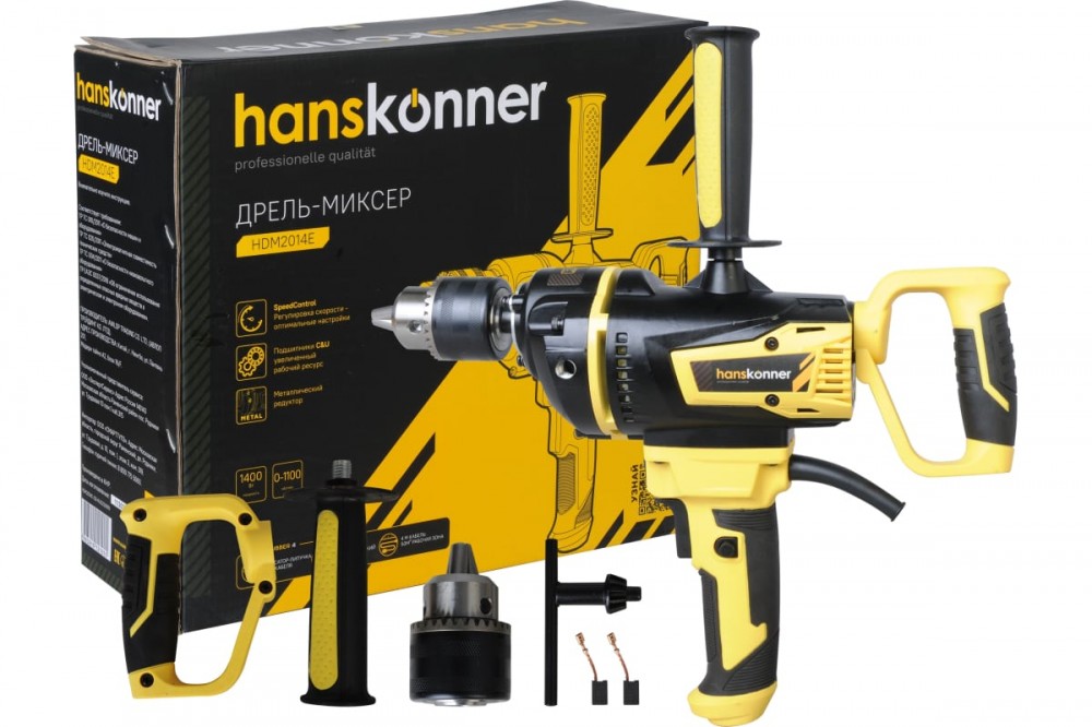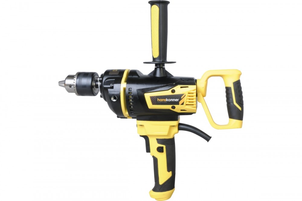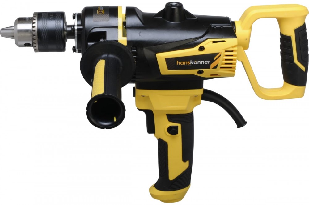 Дрель-миксер Hanskonner HDM2014E — компактный и мощный электроинструмент, с ключевым патроном и надежной конструкцией для сверления отверстий в различных материалах: пластик, дерево, сталь, шлифования различных материалов при помощи корд-щеток, а также для перемешивания технических растворов, смесей, жидких и порошкообразных компонентов с использованием специальных насадок.