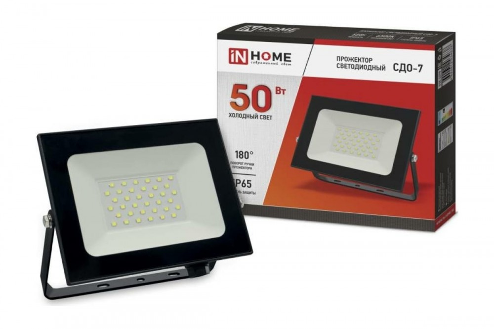 Прожектор светодиодный СДО-7 50Вт 230В 6500К IP65 черный IN HOME 4690612034638