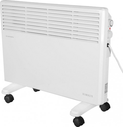 Электроконвектор работает от розетки и отличается удобной конструкцией. Плоский корпус белого цвета оснащен ручкой для плавной регулировки температуры и ручкой выбора режима нагрева. Мощность регулируется в двух диапазонах – 750 и 1500 Вт. В комплект входит набор креплений для фиксации конвектора на стене и шасси на колесах для установки конвектора на полу. При включении устройства нагревательный элемент из алюминиевого сплава быстро достигает рабочей температуры и начинает нагревать поступающий внутрь холодный воздух. Выходящие через решетку радиатора вверх теплые потоки вытесняют более холодные массы, за счет чего происходит конвекция воздуха и в комнате поддерживается заданный температурный режим.