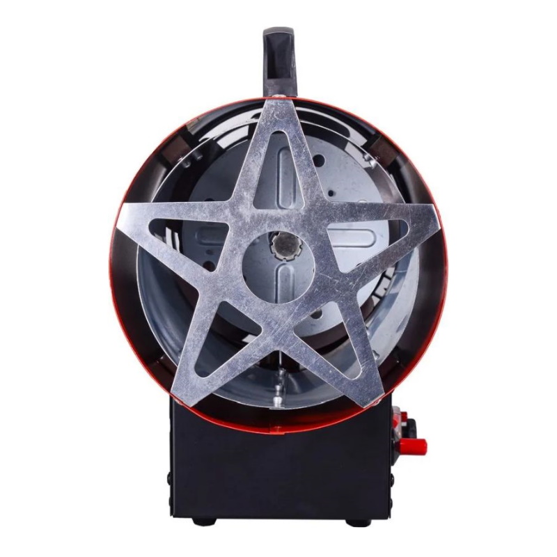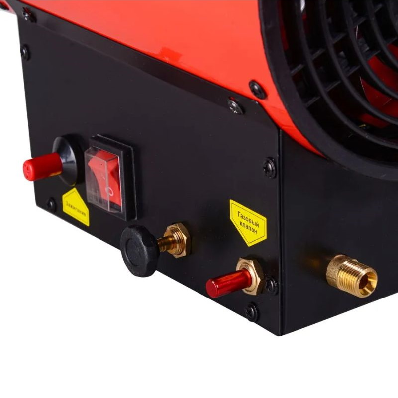 Сжиженный газ создает высокую температуру в камере сгорания тепловой пушки. Электрическая энергия однофазной сети необходима для работы вентилятора и функционирования автоматических узлов. Зажигание осуществляется с помощью пьезоэлектрического элемента. Теплопушка отличается экономичным расходом топлива 0,6-0,9 кг/час. Подача газа осуществляется под давлением 0,7 Бар. Контроль пламени происходит с помощью термодатчика из биметалла. Для обеспечения пожарной безопасности предусмотрена система защиты от перегрева.