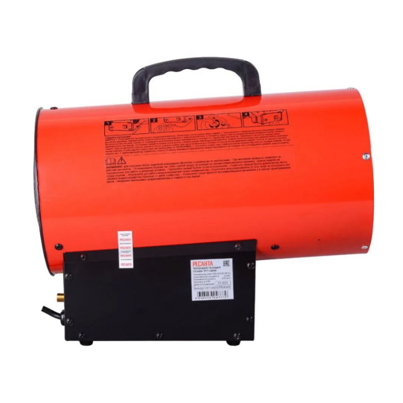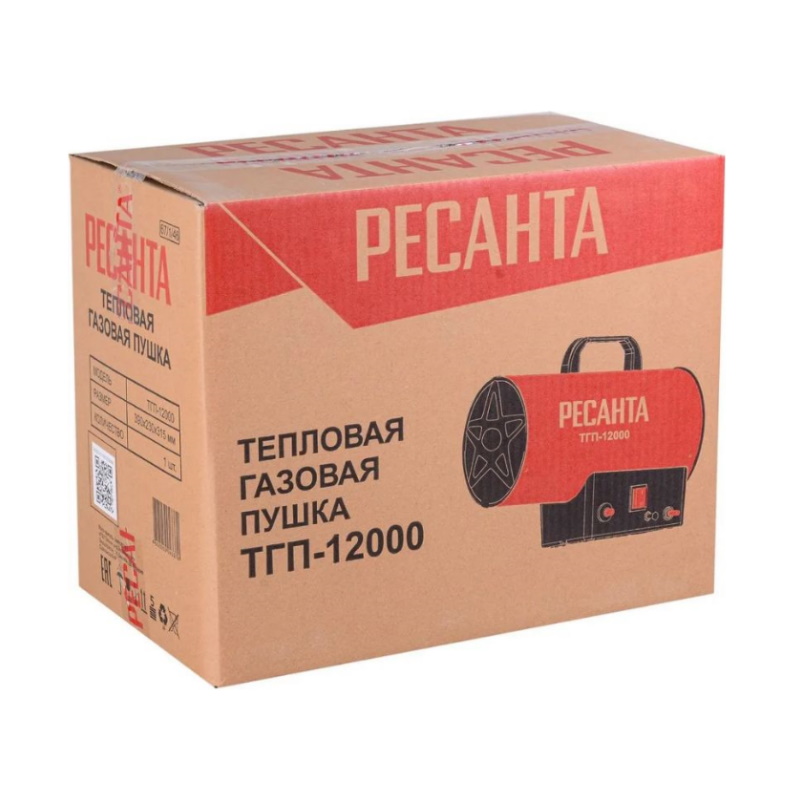 Газовая тепловая пушка Ресанта ТГП-12000 - эффективный нагреватель воздуха, использующий в качестве топлива сжиженные газы: пропан, пропан-бутан, бутан. Применяется для обогрева складских помещений, цехов, ремонтных мастерских площадью до 120 м², а также при монтаже натяжных потолков, для просушки окрашенных стен и штукатурки. Тепловая мощность имеет диапазон 7-12 кВт. Двигатель обеспечивает воздушный поток производительностью 370 м³/час.