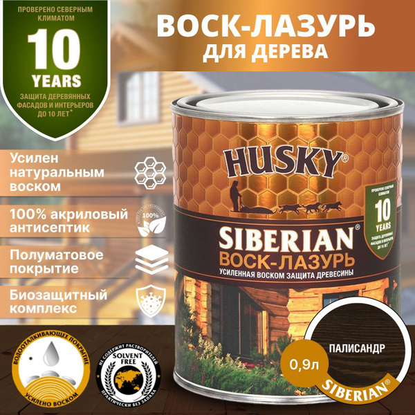 Воск-лазурь для дерева HUSKY Siberian — Усиленный воском декоративно-защитный антисептик для финишной отделки древесины снаружи и внутри помещений. Применяется для окраски деревянных фасадов, стен, конструкций, декоративных элементов снаружи и внутри помещений. Не содержит растворители и практически не пахнет. Сохраняет видимой текстуру древесины. Легко наносится на поверхность и глубоко проникает в структуру древесины. Предохраняет от воздействия грибка, гнили, плесени, синевы, насекомых-древоточцев. Создает водоотталкивающее покрытие, устойчивое к негативному воздействию УФ-излучения солнца. *При соблюдении правил нанесения обеспечивает защиту древесины до 10 лет. Не предназначен для окраски полов и мест, постоянно контактирующих с водой.