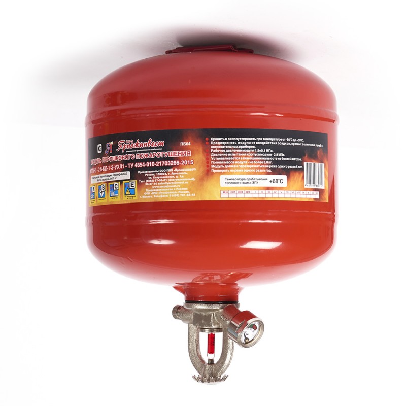 Модуль порошкового пожаротушения МПП-2,5 с термочувствительной колбой Ярпожинвест предназначен для хранения и подачи огнетушащего порошка (ОП) и подавления возгораний пожаров классов А,В,С,Е (легковоспламеняющиеся и горючие жидкости, древесина, бумага, пластмасса и электрооборудование под напряжением до 1000 В). Модули являются самосрабатывающими устройствами и самым эффективным будет их применение вместе с системами автоматической пожарной сигнализации.