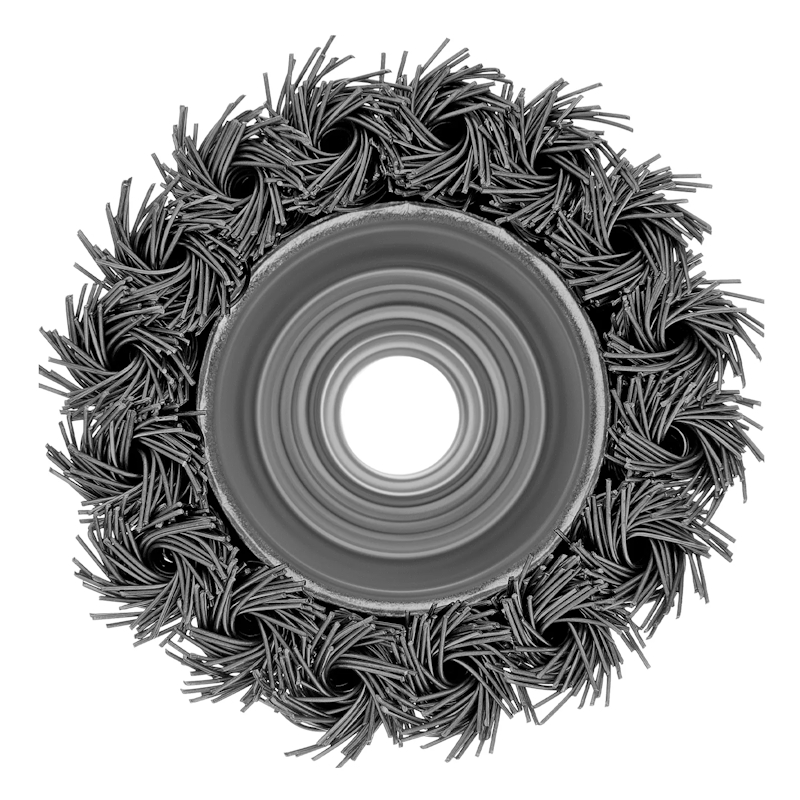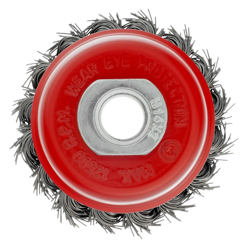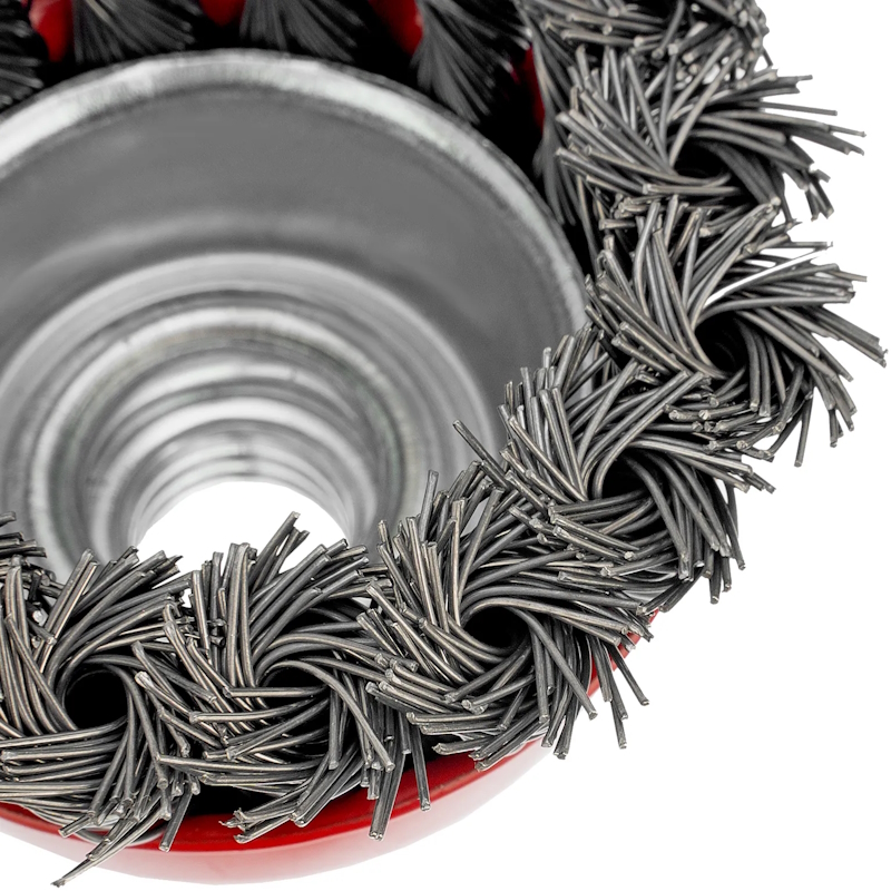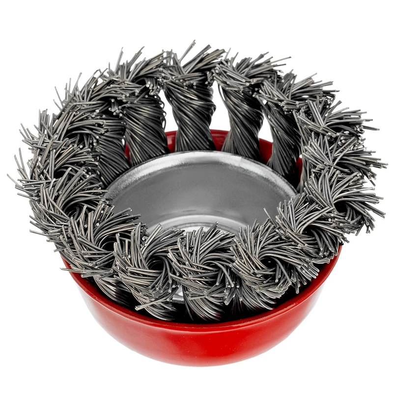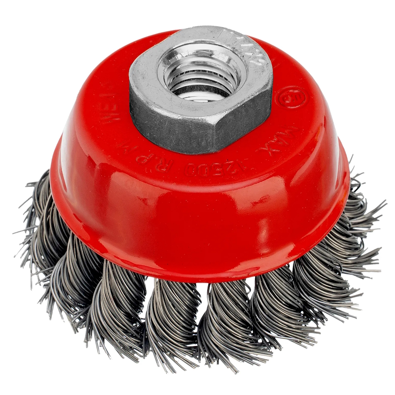 Щетка Matrix «Чашка» 74620 диаметром 65 мм, с присоединительной резьбой М14, с щетиной из крученой проволоки диаметром 0,5 мм, устанавливается на УШМ, поддерживающую работу со скоростью 12500 об/мин. Изделие предназначено для грубой (черновой) обработки поверхностей, подходит для удаления загрязнений, снятия толстого слоя ржавчины, ЛКМ, зачистки сварных швов.