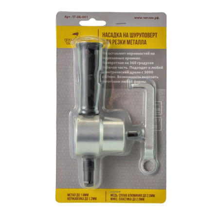 Насадка для резки металла ЧЕГЛОК 17-06-001 предназначена для использования на электро- и пневмодрелях, а также на шуруповертах.