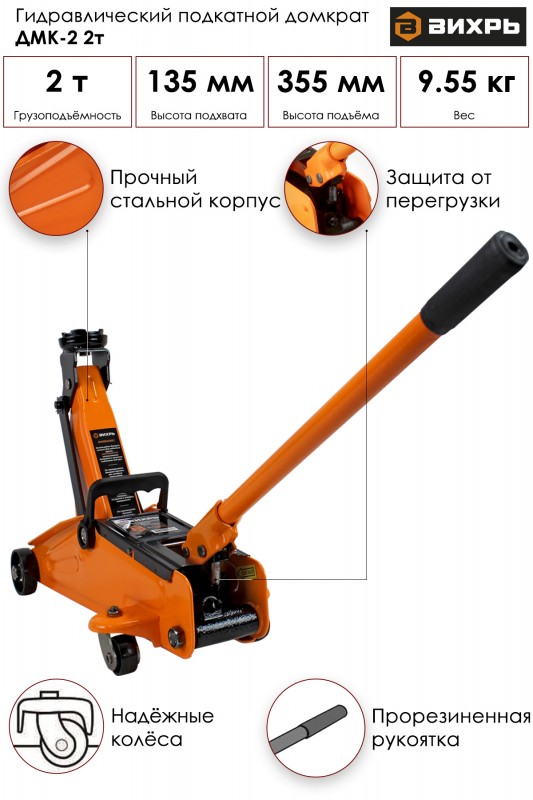 Купить Домкрат гидрав подкатный ДМК-2 (2т, 135-355мм ) Вихрь 73/5/4/2 вы можете в компании Дровосек-НК, оформив заказ в интернет магазине, или отправив заявку по почте, а также по телефону или в офисе компании.