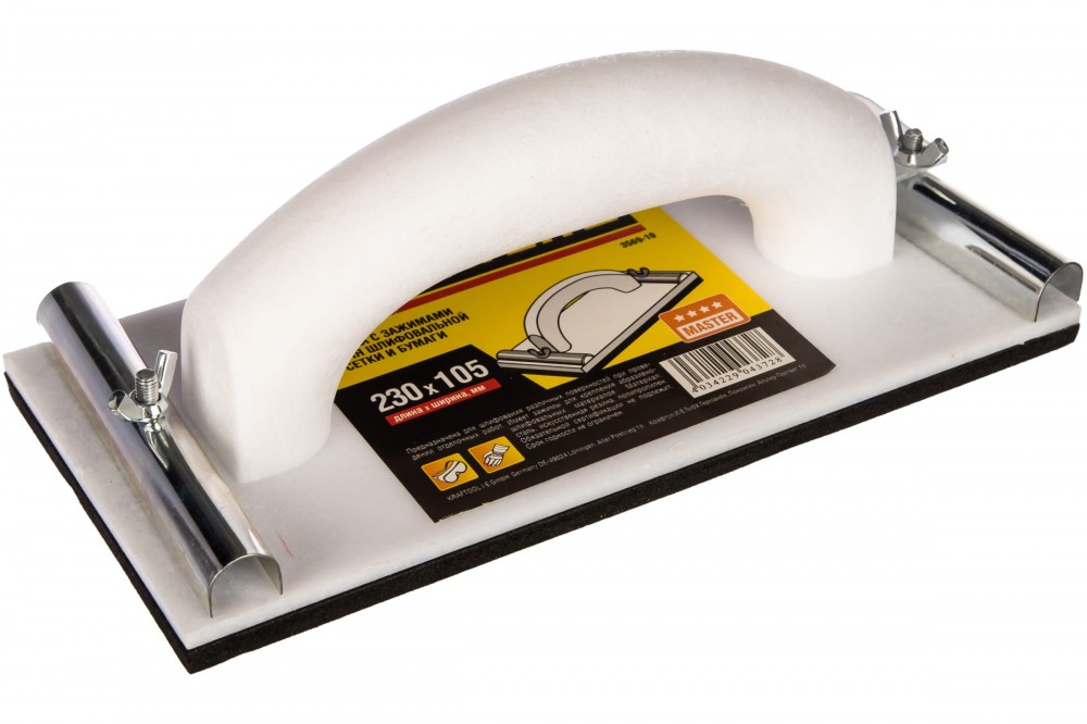 Терка для шлифования с металлическим фиксатором, 100x230мм STAYER 3569-10 используется в качестве инструмента для финишного выравнивания стен. Корпус изготовлен из прочной пластмассы с резиновым покрытием. По краям расположены металлические зажимы, которые позволяют фиксировать абразивную сетку или бумагу для затирки.