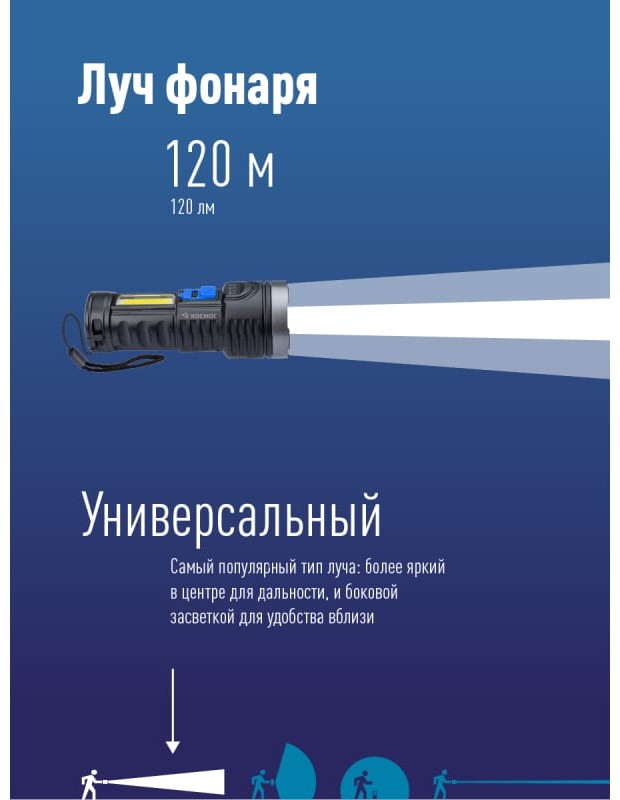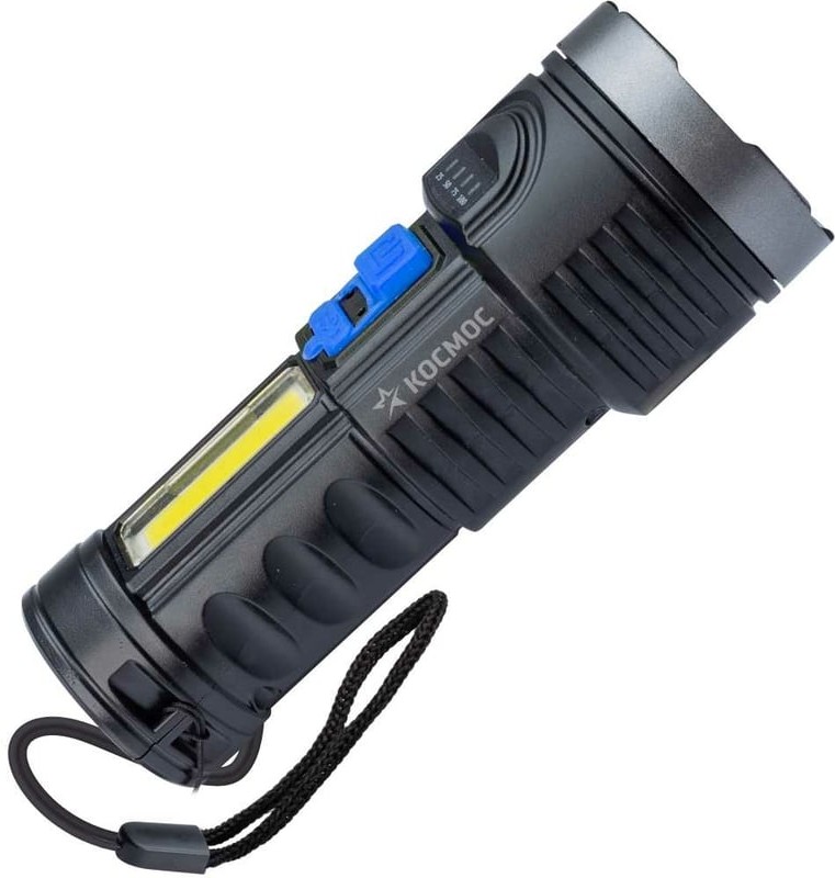 Ручной аккумуляторный фонарь КОСМОС 3Вт LED+3Вт COB, Li-ion 18650 1200mAh, ABS-пластик, индикатор, USB-шнур KOS115Lit с мощностью и свойствами прожектора в легком ручном корпусе. Совмещает луч фонаря (направленный свет) и широкий свет (освещает широкое пространство с одной стороны). Источник питания: Li-ion аккумулятор 18650 3,7В 1200 мА/ч (встроенный). Источник света: мощный луч 3Вт LED; мощный боковой светильник 3Вт COB LED.