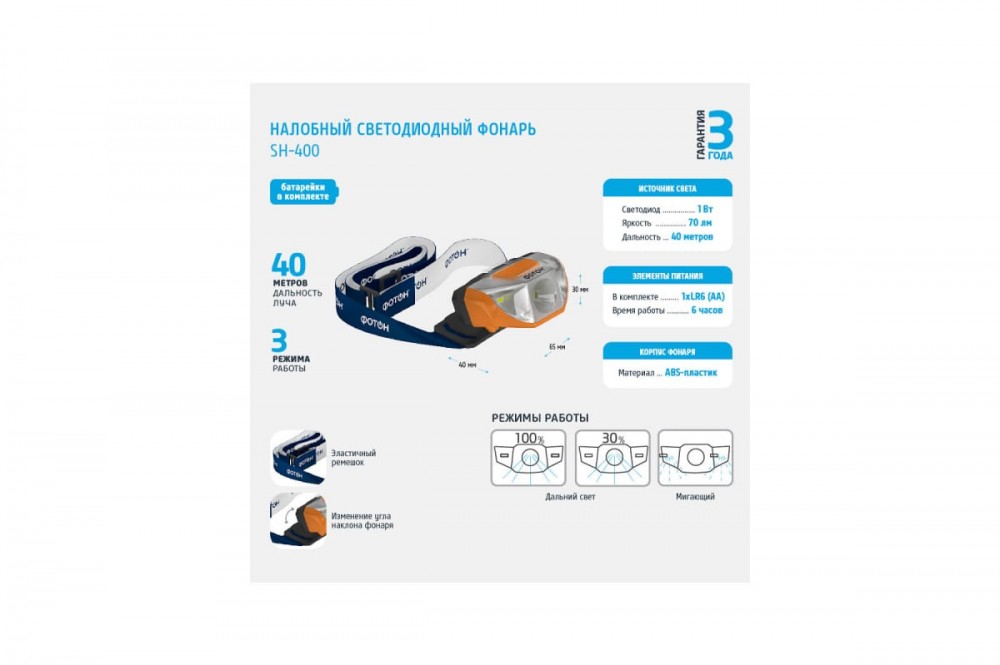 Фонарь налобный светодиодный Фотон SH-400 – модель с уникальным дизайном корпуса, форма фонаря и его цветовое решение созданы в стиле профессионального инструмента.