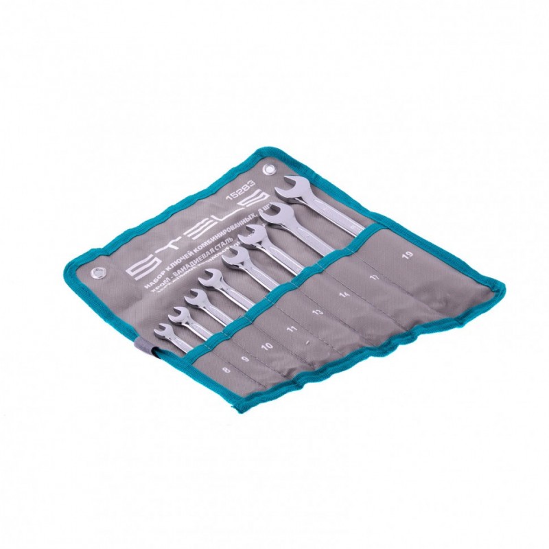 Изготовлен из хромованадиевой стали и обладает высокой прочностью. Имеет долгий срок службы. Преимущества набора комбинированных ключей STELS 15283 Хромованадиевая сталь и хромоникелевое матовое покрытие - высокая прочность и долговечность инструмента. Твердость материала соответствует ГОСТу (48 HRс). Профиль каждого ключа имеет двенадцать граней, что обеспечивает больший захват рабочей поверхности. Головка ключа под углом 15°С к основной оси - более эффективная работа. Для удобства хранения и транспортировки STELS 15283 предусмотрен чехол, в котором каждый ключ находится в отдельном кармане.