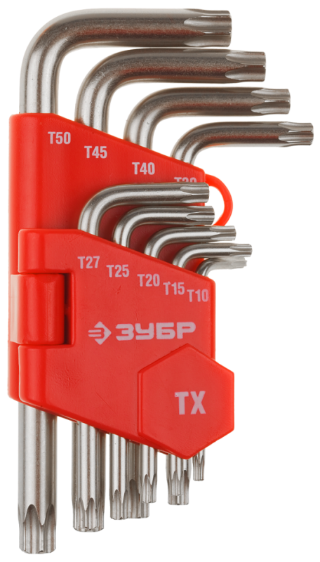 Набор имбусовых коротких ключей TORX Т10-Т50, 9 шт ЗУБР МАСТЕР 27462-1_z02 используется для выполнения сборочных работ с применением крепежных элементов, имеющих внутренний рабочий профиль TORX. В комплект входит 9 изогнутых двусторонних ключей, которые обладают повышенной прочностью за счет высокого качества используемой стали.