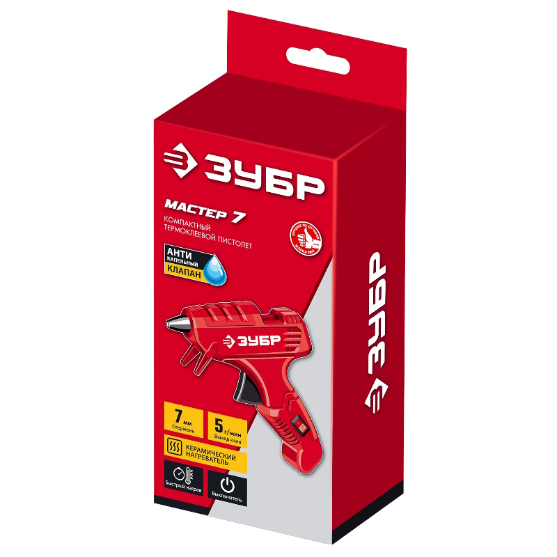 ЗУБР Мастер 7 Пистолет термоклеевой электрический d 7 мм, 5 г/мин 06851-7 - наивысшее качество выполнения надежного склеивания различных материалов: древесина, металл, керамика, стекло, пласт масса, кожа, ткань – при помощи разогретого клея.