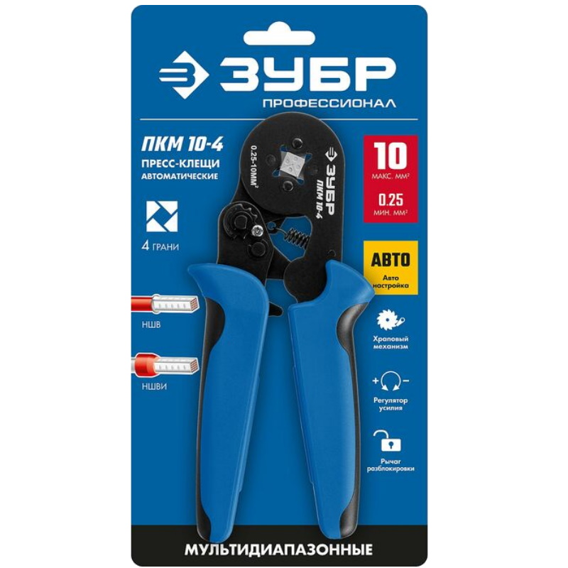 Пресс-клещи мультидиапазонные 0,25-10мм2, квадратный профиль ЗУБР Профессионал ПКМ-10-4 22695