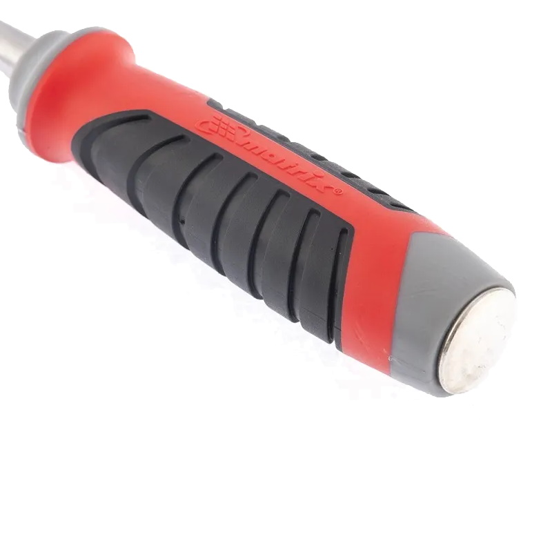Обрезиненная трехкомпонентная рукоятка с рельефным дизайном препятствует скольжению руки, за счет чего работать с инструментом комфортно и безопасно.