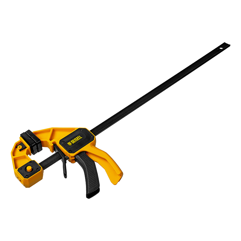 Комфортное использование — струбцина весит всего 710 г, обрезиненная кнопка фиксации обеспечивает удобный захват.