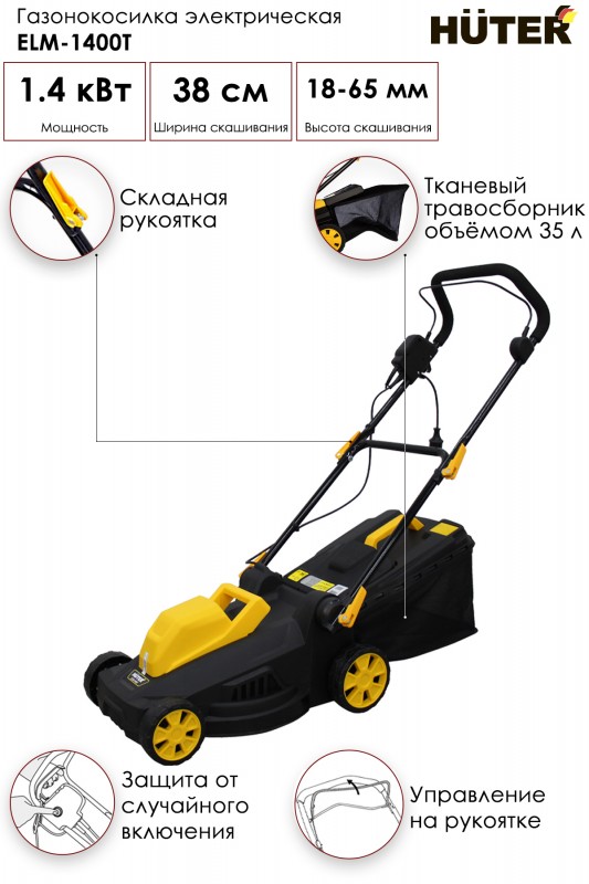 Электрическая газонокосилка Huter ELM-1400Т 70/4/6 с шириной захвата 38 см подходит для участков площадью 400 кв.м. Оснащена мягким травосборником объемом 35 литров, в который попадает скошенная трава. Электродвигатель отличается низким уровнем шума. Складная рукоятка упрощает транспортировку и хранение косилки.