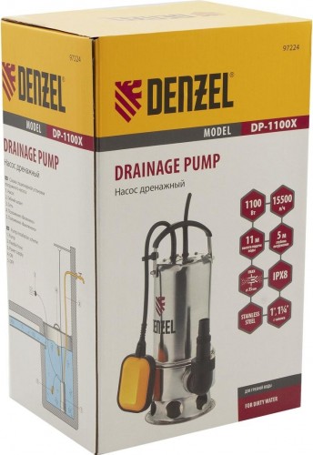 Дренажный насос Denzel DP1100X 97224 мощностью 1100 Вт и производительностью 15500 л/ч, с высотой подъема 11 м, используется для организации системы водоснабжения и полива. Также обеспечивает эффективное отведение грязной воды с содержанием частиц до 35 мм из подвалов и резервуаров.