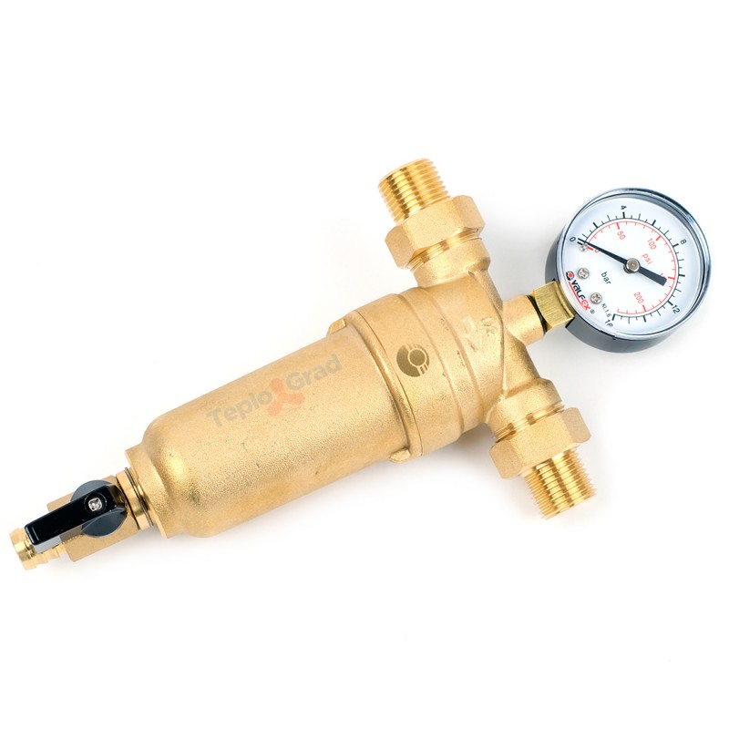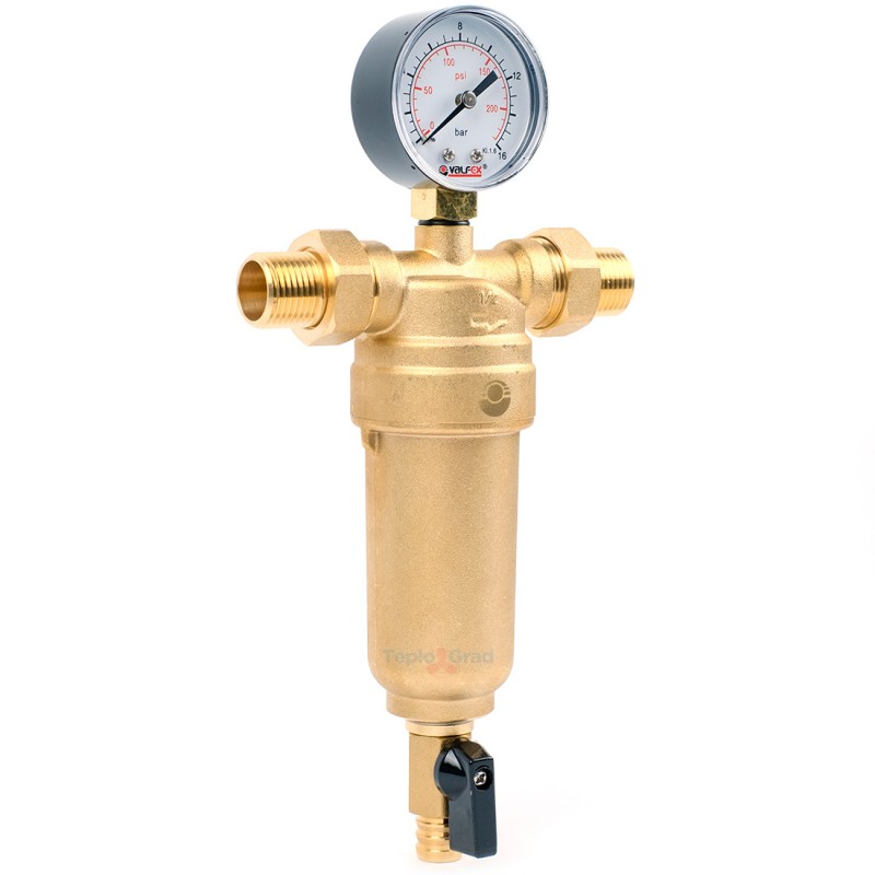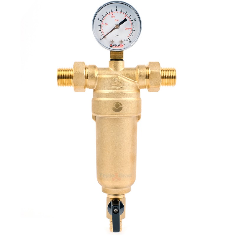 Самопромывной фильтр Valfex 1/2 с манометром и корпусом из латуни для защиты систем водоснабжения от твёрдых механических примесей. Для изготовления фильтра использована латунь, сетка выполнена из нержавеющей стали. В состав конструкции входят манометр для контроля давления в системе.