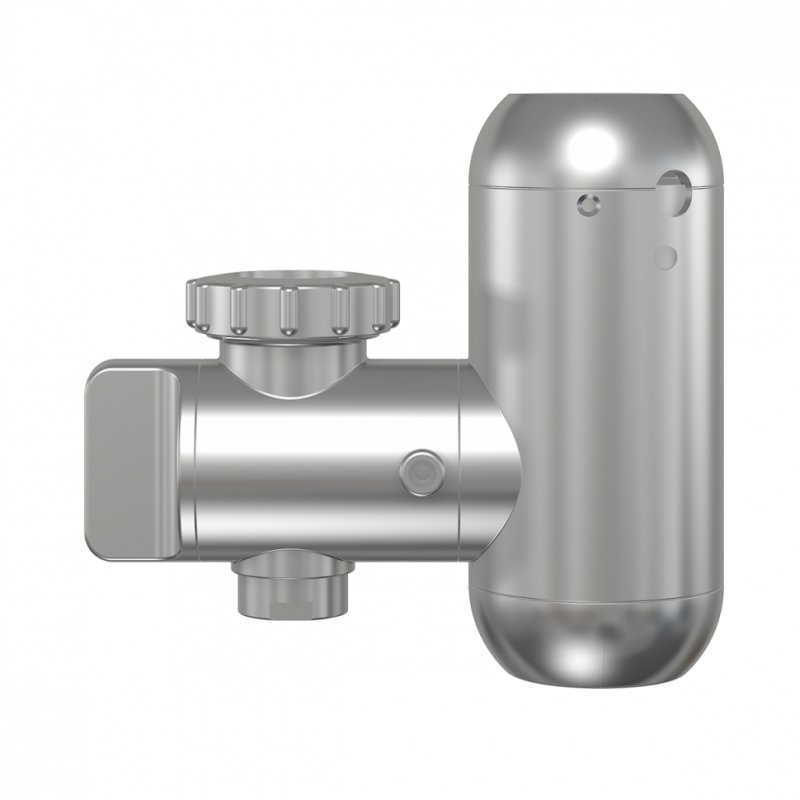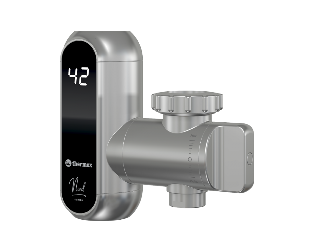 Проточный водонагреватель в оригинальном корпусе для встраивания в кухонную мойку с индикацией нагрева и регулятором производительности.